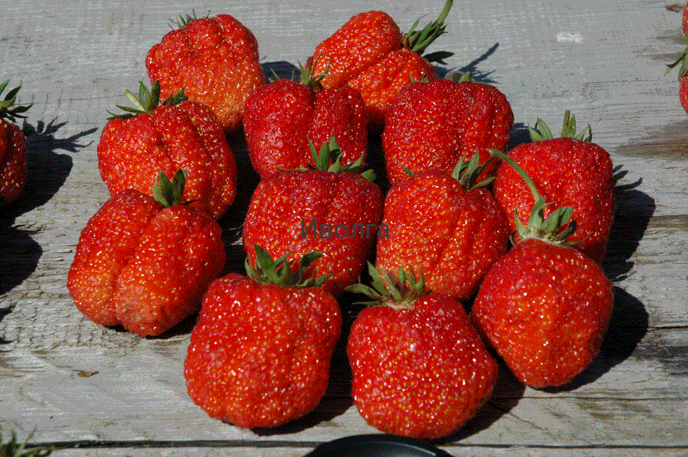Ягоды крупные, имеют сладкий вкус, по форме коническая, немного сплюснутая, некоторые ягодки трапециевидной формы.